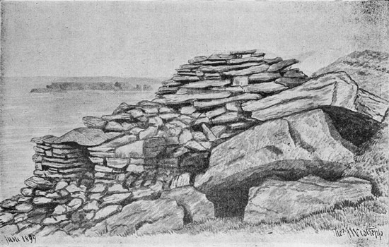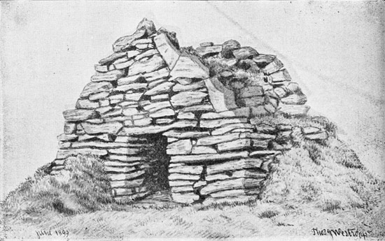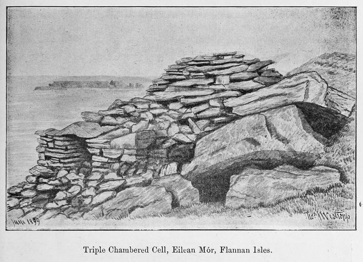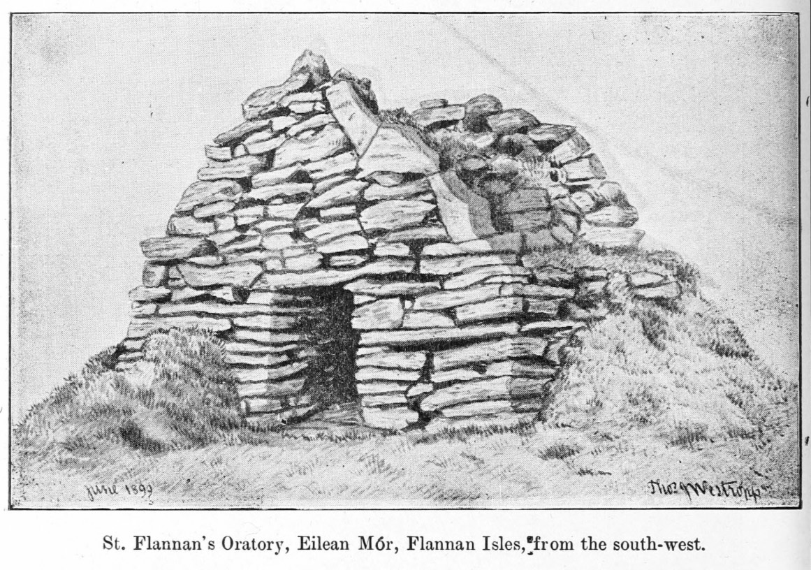 Фланнанские острова: молельня св.Фланнана на о-ве Эйлин-Мор с юго-запада. Рис. Thomas Johnson Westropp, июнь 1899 г.[тыц]