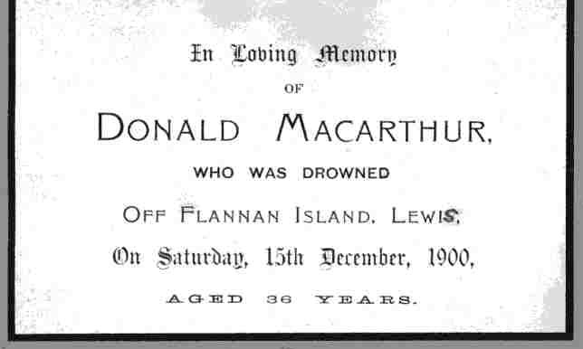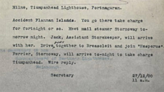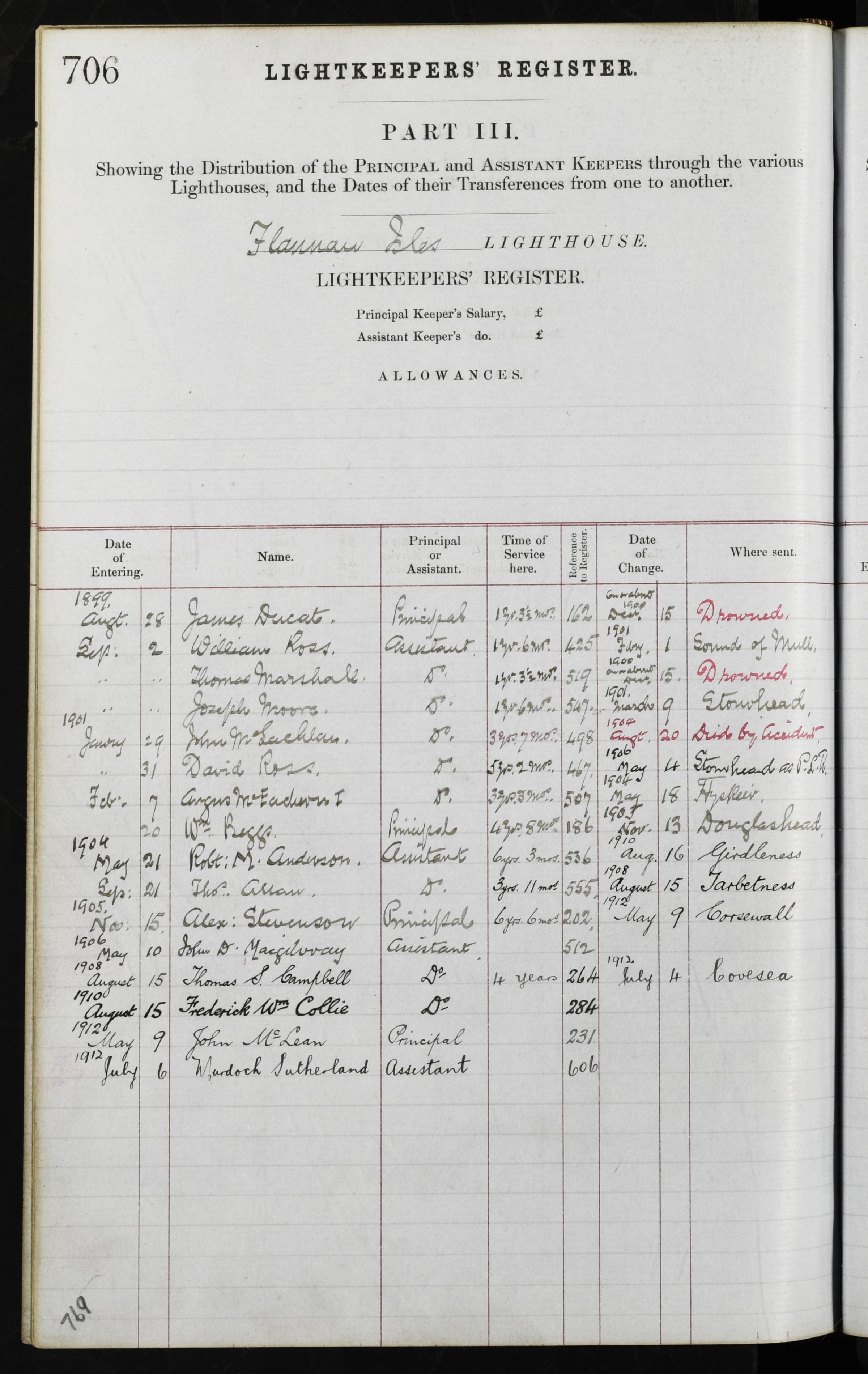 17 апреля 1896 года он был повышен до главного смотрителя маяка Лох-Райан и, наконец, 24 июля 1899 г. назначен на Фланнанские острова.[тыц]