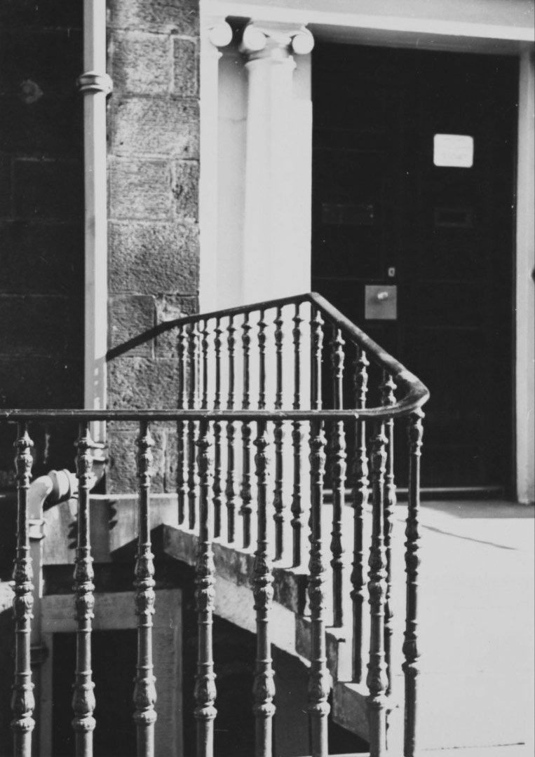 Справа виден флагшток, внизу - стойка солнечных часов. Фонарная без штор. В южной и северной сторонах ограды проделаны проходы. Около 1971 г.