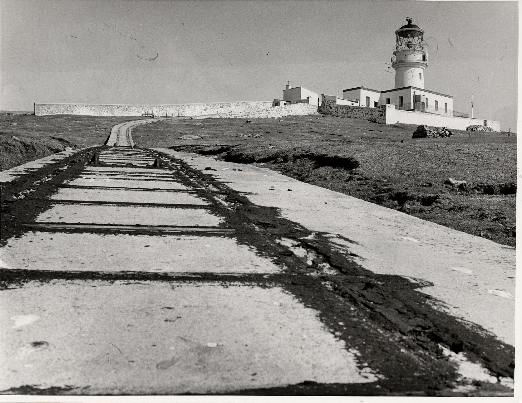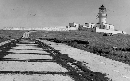 Маяк готовится к автоматизации: фонарь уже заменён на маленький, шторы убраны. Чуть левее маяка виден флагшток. Возле старых развалин сидит смотритель маяка Рон Айрленд. 1969-1970 г.г.
